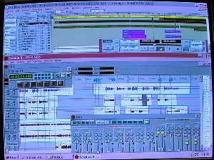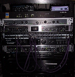 The equipment rack includes a valve preamp by Behringer. The valve glows